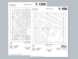 These maps are site centered and can be printed in a variety of sizes from A4 to A0 with scales from 1:200 to 1:2500. We can change the orientation; and select, highlight and measure areas of interest. These maps are available in black and white or colour.